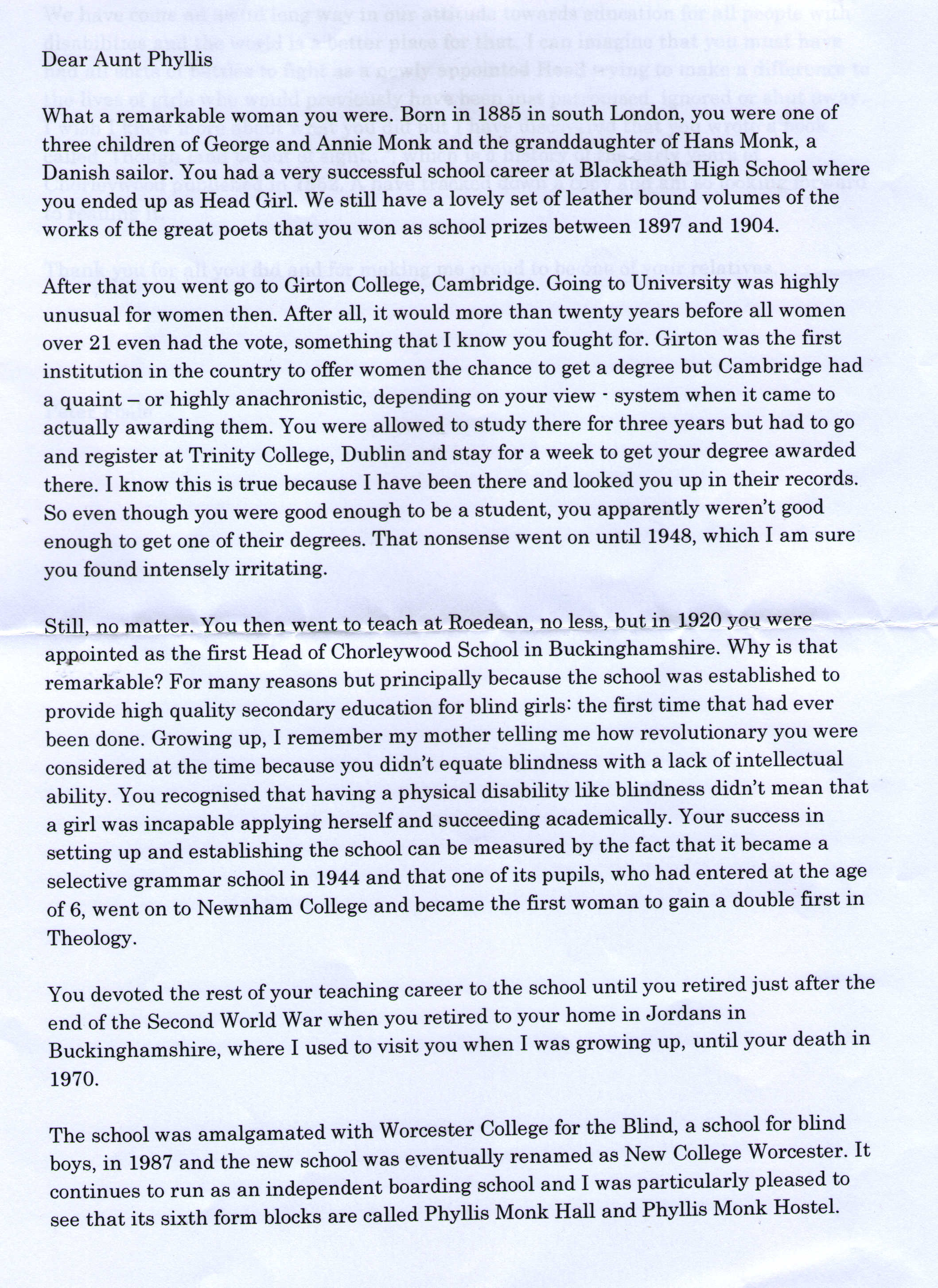 The school was amalgamated with Worcester College for the Blind, a school for blind boys, in 1987 and the new school was eventually renamed as New College Worcester. It continues to run as an independent boarding school and I was particularly pleased to see that its sixth form blocks are called Phyllis Monk Hall and Phyllis Monk Hostel.