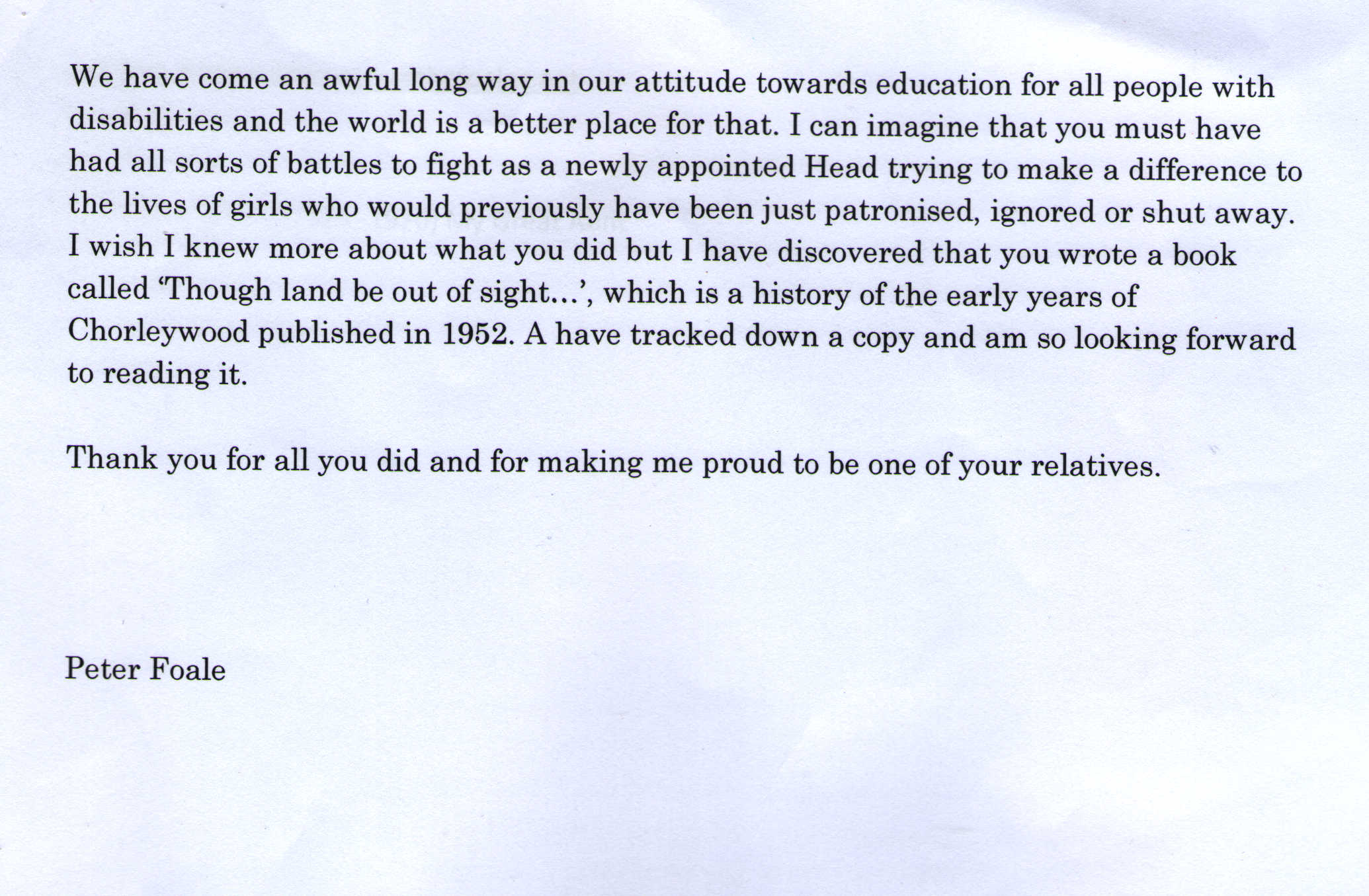 We have come an awful long way in our attitude towards education for all people with disabilities and the world is a better place for that. I can imagine that you must have had all sorts of battles to fight as a newly appointed Head trying to make a difference to the lives of girls who would previously have been just patronised, ignored or shut away. I wish I knew more about what you did but I have discovered that you wrote a book called “Tough land be out of sight…” which is a history of the early years of Chorleywood published in 1952. I have tracked down a copy and am so looking forward to reading it.
