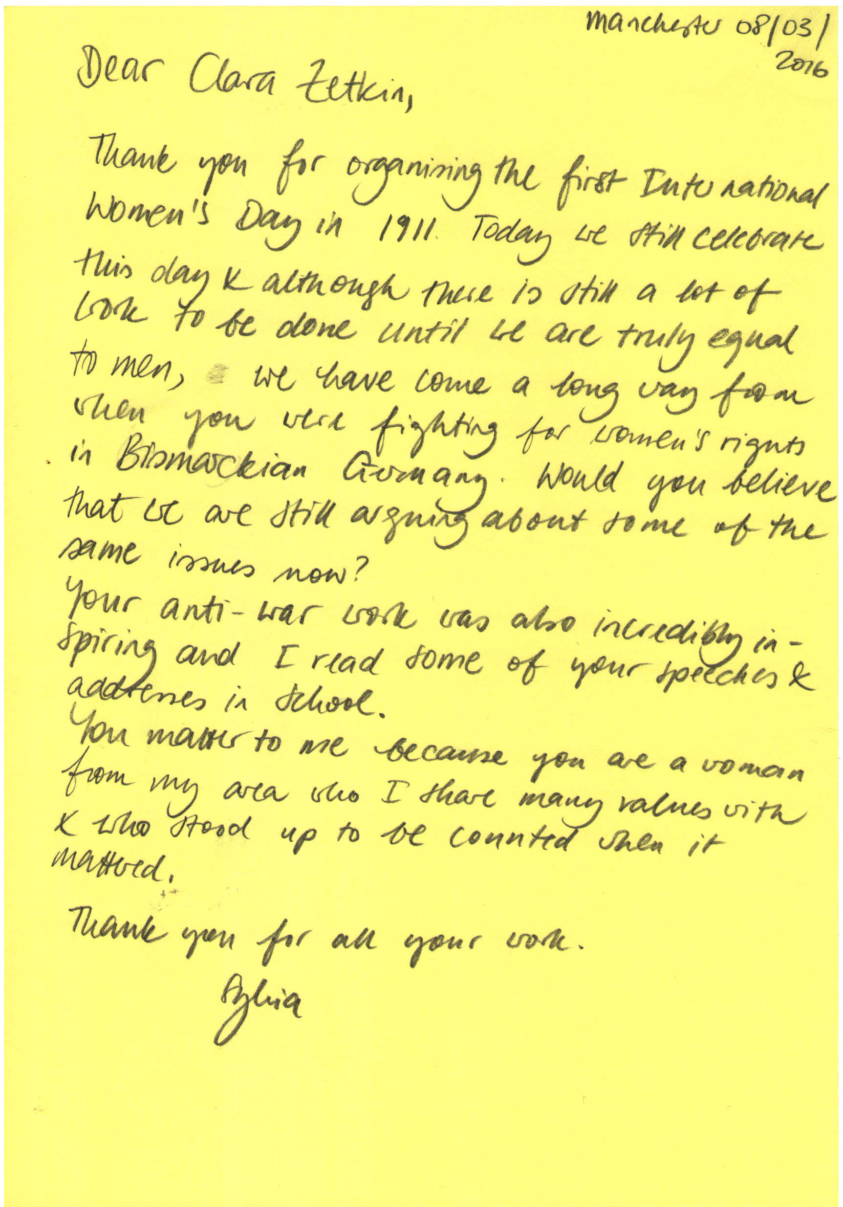 Thank you for organising the first International Women’s Day in 1911. Today we still celebrate this day & although there is still a lot of work to be done until we are truly equal to men, we have come a long wayfrom when you were fighting for women’s rights in Bismarckian Germany. Would you believe that we are still arguing about some of the same issues now?